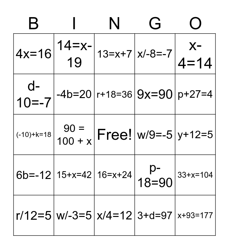 This bingo card has a free space and 42 words: x+8=13, r+18=36, y+27=89, 15+x=42, 3+d=97, 33+x=104, x+93=177, x+64=90, 13=x+7, 16=x+24, y+12=5, p+27=4, 90 = 100 + x, x-4=14, x-15=89, p-18=90, (-19)+x=2, (-10)+k=18, e-85=114, 14=x-19, d-10=-7, f-18=-14, 107=t-14, 4x=16, 3x=12, 6x=48, 9x=90, 8x=-64, 25=5x, 72=8x, -16=2x, 6b=-12, -4b=20, x/4=12, r/8-=6, r/12=5, w/-3=5, w/9=-5, t/7=4, y/10=3, x/-8=-7 and k/4=-5.