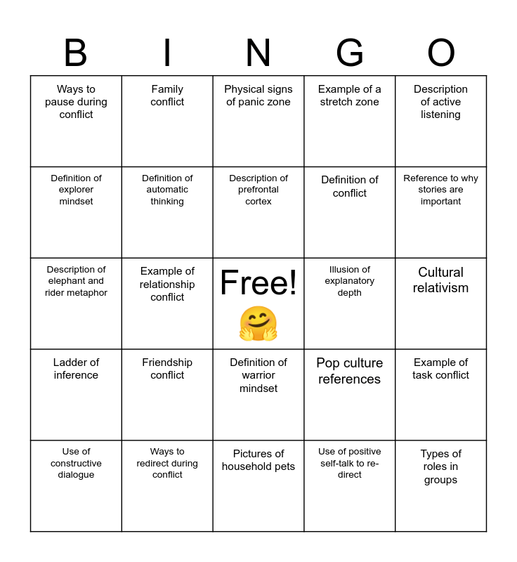 This bingo card has a free space and 28 words: Example of task conflict, Roommate Conflict, Definition of conflict, Use of positive self-talk to re-direct, Definition of explorer mindset, Physical signs of panic zone, Family conflict, Ladder of inference, Illusion of explanatory depth, Use of constructive dialogue, Description of elephant and rider metaphor, Example of a stretch zone, Ways to redirect during conflict, Pictures of household pets, Reference to why stories are important, Phases of group development, Friendship conflict, Definition of automatic thinking, Description of prefrontal cortex, Definition of warrior mindset, Ways to pause during conflict, Description of amygdala, Types of roles in groups, Example of relationship conflict, Cultural relativism, Pop culture references, Description of active listening and Description of biases.