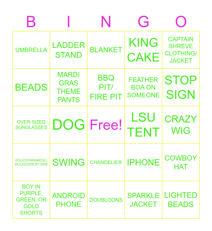 This bingo card has a free space and 39 words: JESTER HAT, STROLLER, BALL, MARDI GRAS THEME PANTS, BOY IN PURPLE, GREEN, OR GOLD SHORTS, CHANDELIER, BBQ PIT/ FIRE PIT, SLIDE, CAPTAIN SHREVE CLOTHING/ JACKET, POLICE/PARAMEDIC MULES/SIDE BY SIDE, DOG, KING CAKE, LIGHTED BEADS, CRAZY WIG, LSU TENT, SWING, INSTRUMENT, UMBRELLA, PURPLE LAWN CHAIR, IPHONE, BEADS, DOUBLOONS, FEATHER BOA ON SOMEONE, STOP SIGN, MASK, TWO PEOPLE KARAOKING, GREEN SHOES, FIREMAN, "MARDI GRAS" THE WORDS, LADDER STAND, TRAFFIC LIGHT, HEATER, BLANKET, ANDROID PHONE, SPARKLE JACKET, WAGON, COWBOY HAT, OVER-SIZED SUNGLASSES and BLUE ICE CHEST.