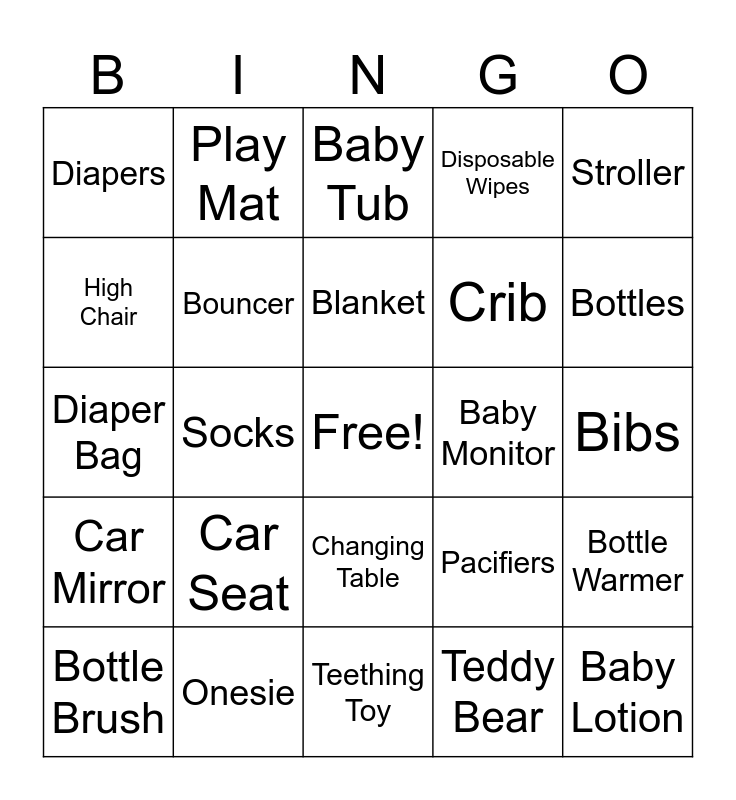 This bingo card has a free space and 24 words: Car Seat, Onesie, Blanket, Bottle Brush, Stroller, Diapers, High Chair, Play Mat, Baby Monitor, Changing Table, Crib, Diaper Bag, Pacifiers, Bottle Warmer, Bouncer, Teddy Bear, Bibs, Baby Tub, Bottles, Socks, Baby Lotion, Car Mirror, Disposable Wipes and Teething Toy.