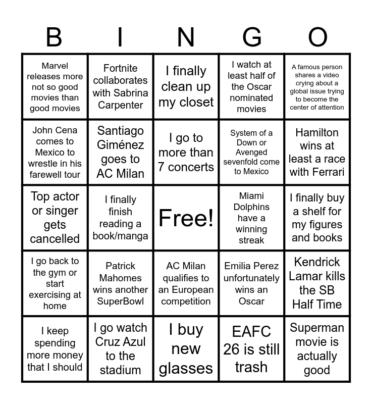 This bingo card has a free space and 24 words: Patrick Mahomes wins another SuperBowl, I go watch Cruz Azul to the stadium, I go to more than 7 concerts, I keep spending more money that I should, A famous person shares a video crying about a global issue trying to become the center of attention, Marvel releases more not so good movies than good movies, John Cena comes to Mexico to wrestle in his farewell tour, Fortnite collaborates with Sabrina Carpenter, Miami Dolphins have a winning streak, AC Milan qualifies to an European competition, System of a Down or Avenged sevenfold come to Mexico, Top actor or singer gets cancelled, Emilia Perez unfortunately wins an Oscar, Kendrick Lamar kills the SB Half Time, Santiago Giménez goes to AC Milan, EAFC 26 is still trash, I finally buy a shelf for my figures and books, I finally clean up my closet, Hamilton wins at least a race with Ferrari, I finally finish reading a book/manga, Superman movie is actually good, I go back to the gym or start exercising at home, I watch at least half of the Oscar nominated movies and I buy new glasses.