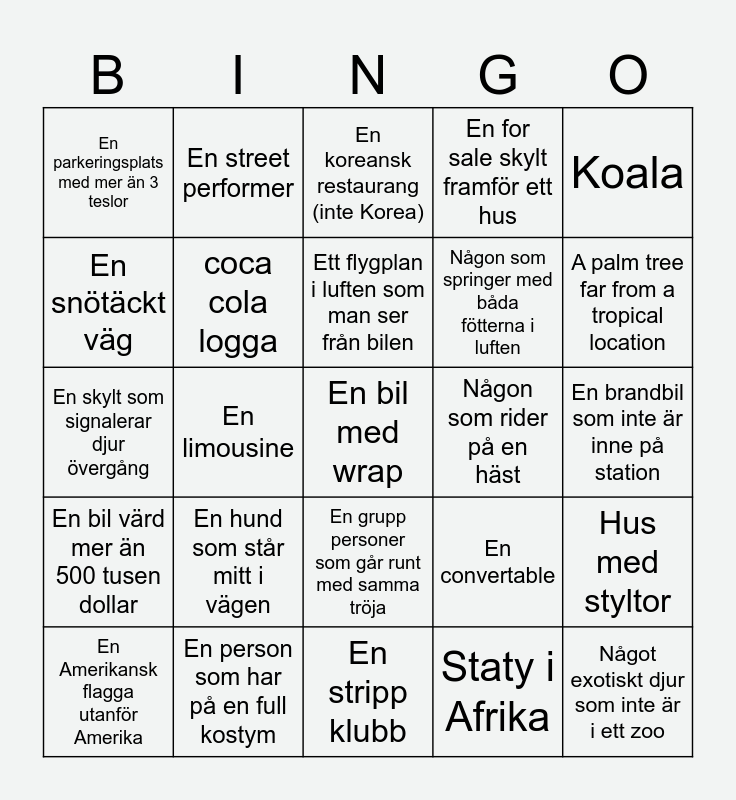 This bingo card has a free space and 24 words: En Amerikansk flagga utanför Amerika, En hund som står mitt i vägen, Ett flygplan i luften som man ser från bilen, Staty i Afrika, Koala, En parkeringsplats med mer än 3 teslor, En street performer, En koreansk restaurang (inte Korea), Någon som rider på en häst, En brandbil som inte är inne på station, En skylt som signalerar djur övergång, coca cola logga, En convertable, Hus med styltor, En snötäckt väg, En person som har på en full kostym, En stripp klubb, En for sale skylt framför ett hus, A palm tree far from a tropical location, En bil värd mer än 500 tusen dollar, En limousine, En grupp personer som går runt med samma tröja, Någon som springer med båda fötterna i luften and Något exotiskt djur som inte är i ett zoo.