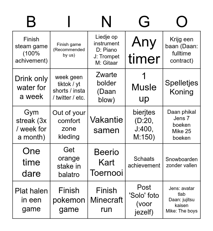 This bingo card has a free space and 24 words: Get orange stake in balatro, Finish pokemon game, Zwarte bolder (Daan blow), Plat halen in een game, Krijg een baan (Daan: fulltime contract), Finish steam game (100% achivement), Drink only water for a week, Finish game (Recommended by us), bierjtes (D:20, J:400, M:150), Beerio Kart Toernooi, 1 Musle up, Gym streak (3x / week for a month), Schaats achievement, Snowboarden zonder vallen, week geen tiktok / yt shorts / insta / twitter / etc., Post 'Solo' foto (voor jezelf), Daan phikal Jens 7 boeken Mike 25 boeken, Liedje op instrument D: Piano J: Trompet M: Gitaar, Spelletjes Koning, Out of your comfort zone kleding, Jens: avatar tlab Daan: jujitsu kaisen Mike: The boys, One time dare, Any timer and Finish Minecraft run.