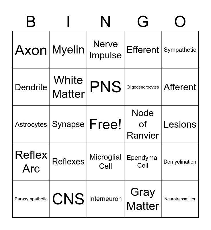 This bingo card has a free space and 24 words: Reflexes, CNS, PNS, Parasympathetic, Sympathetic, Axon, Dendrite, Myelin, Node of Ranvier, Microglial Cell, Oligodendrocytes, Astrocytes, Ependymal Cell, Demyelination, White Matter, Gray Matter, Lesions, Nerve Impulse, Afferent, Synapse, Neurotransmitter, Reflex Arc, Efferent and Interneuron.