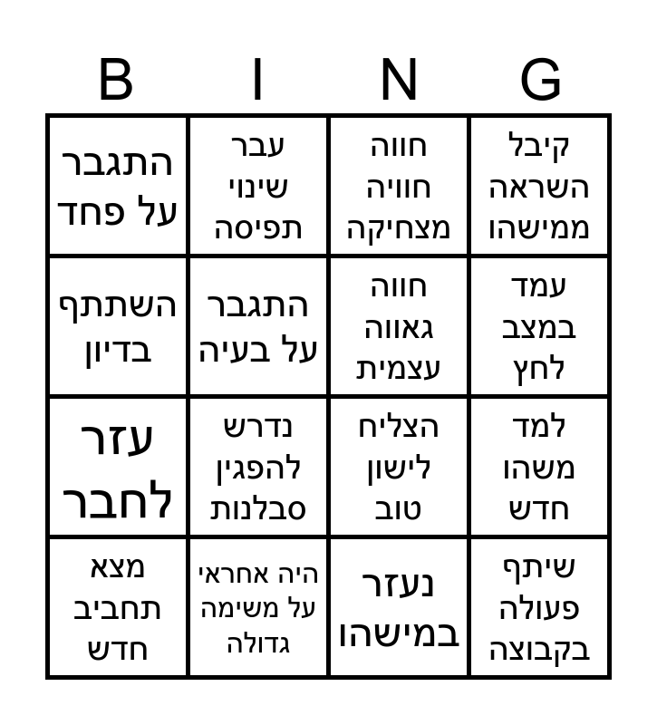 This bingo card has 16 words: היה אחראי על משימה גדולה, למד משהו חדש, חווה חוויה מצחיקה, התגבר על פחד, עזר לחבר, עבר שינוי תפיסה, הצליח לישון טוב, נעזר במישהו, השתתף בדיון, התגבר על בעיה, מצא תחביב חדש, קיבל השראה ממישהו, נדרש להפגין סבלנות, עמד במצב לחץ, חווה גאווה עצמית and שיתף פעולה בקבוצה.