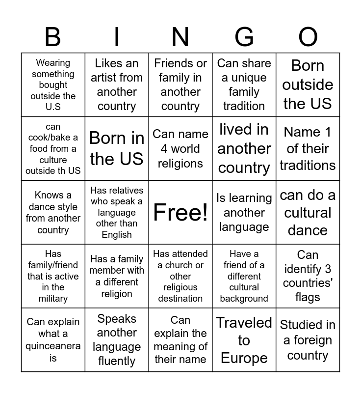 This bingo card has a free space and 29 words: Has visited another country, Speaks another language fluently, Friends or family in another country, Enjoys music in another language, Born outside the US, Wearing something bought outside the U.S, Born in the US, Can name 4 world religions, Is learning another language, Can identify 3 countries' flags, Can explain what a quinceanera is, Has relatives who speak a language other than English, Traveled to Europe, Studied in a foreign country, Knows a dance style from another country, Has been to a bar/bat mitzvah, Can explain the meaning of their name, Have a friend of a different cultural background, Name 1 of their traditions, Has family/friend that is active in the military, Has a family member with a different religion, Is a vegetarian, lived in another country, can do a cultural dance, can cook/bake a food from a culture outside th US, Likes an artist from another country, Has attended a church or other religious destination, Can share a unique family tradition and has an item passed down to them from a family member.