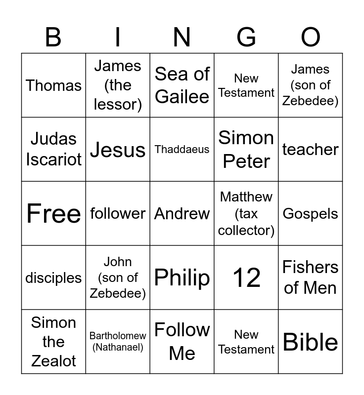 This bingo card has a free space and 24 words: John (son of Zebedee), Bartholomew (Nathanael), Thaddaeus, Simon the Zealot, James (son of Zebedee), Thomas, Judas Iscariot, James (the lessor), Matthew (tax collector), Philip, Simon Peter, Free, 12, Fishers of Men, Jesus, New Testament, Gospels, Sea of Gailee, teacher, follower, Bible, disciples, New Testament and Follow Me.