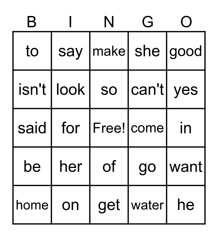 This bingo card has a free space and 32 words: water, from, for, again, be, look, good, want, say, says, so, make, his, some, come, out, home, said, of, her, go, my, in, on, he, she, can't, isn't, to, get, no and yes.