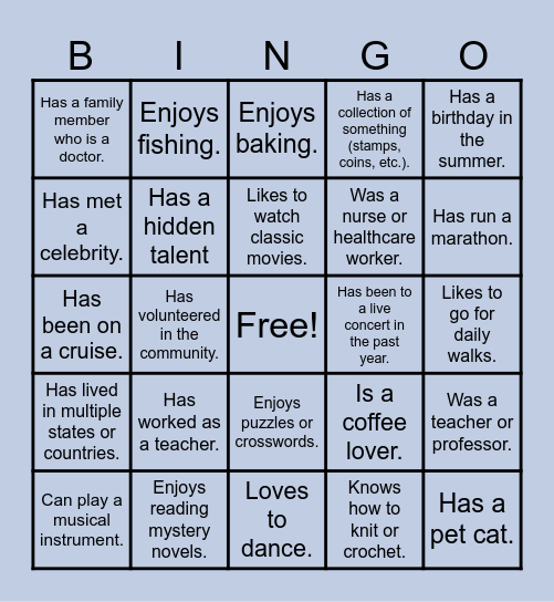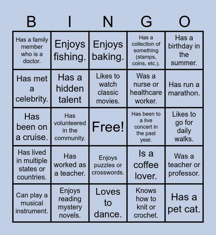 This bingo card has a free space and 43 words: Has traveled to another country., Has a pet cat., Has been married for over 40 years., Can play a musical instrument., Loves gardening., Knows how to knit or crochet., Enjoys baking., Has lived in the community for more than 10 years., Has a birthday in the summer., Enjoys reading mystery novels., Has a collection of something (stamps, coins, etc.)., Has been to a live concert in the past year., Enjoys puzzles or crosswords., Has worked as a teacher., Can speak more than one language., Loves to dance., Is an expert at board games., Has been on a cruise., Enjoys painting or drawing., Has run a marathon., Enjoys fishing., Has won a prize in a raffle., Has a green thumb (great at growing plants)., Has a family member who is a doctor., Enjoys photography., Likes to go for daily walks., Knows how to make homemade jam or preserves., Has a favorite sports team., Is a coffee lover., Has lived in multiple states or countries., Can tell a great joke., Was a teacher or professor., Loves animals., Has volunteered in the community., Has a special talent or skill (e.g., juggling, magic tricks)., Has lived in the same house for decades., Enjoys making puzzles (jigsaw or brain teasers)., Likes to watch classic movies., Has met a celebrity., Was a nurse or healthcare worker., Has been on a road trip across the country., Has a hidden talent and Has a favorite childhood book or author..