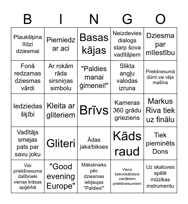 This bingo card has a free space and 34 words: Netipisks grims, Viens bekvokālists/e vairākiem priekšnesumiem, Saulesbrilles, Dejotāji, Vadītājs smejas pats par savu joku, Ar rokām rāda sirsniņas simbolu, Dziesma par mīlestību, Visi priekšnesuma dalībnieki vienas krāsas apģērbā, Piemiedz ar aci, Tautisks tērps vai motīvs, "Paldies manai ģimenei!", Basas kājas, Operators vai kamera kadrā, Trīc rokas, Kameras 360 grādu grieziens, Priekšnesumā dūmi vai vēja mašīna, "Good evening Europe", Iedziedas šķībi, Gliteri, Kāds raud, Ādas jaka/bikses, 90-to/2000-šo ģērbšanās stils, Plaukšķina līdzi dziesmai, Markus Riva tiek uz finālu, Mākslinieks pēc dziesmas iebļaujas "Paldies!", Uz skatuves spēlē mūzikas instrumentu, Neizdevies dialogs starp šova vadītājiem, Sarkana kleita, Slikta angļu valodas izruna, Fonā redzamas dziesmas vārdi, Kādam galvā cepure, Kleita ar gliteriem, Tiek pieminēts Dons and "Es darīju visu ko, varēju..." "Atdevu no sevis visu...".