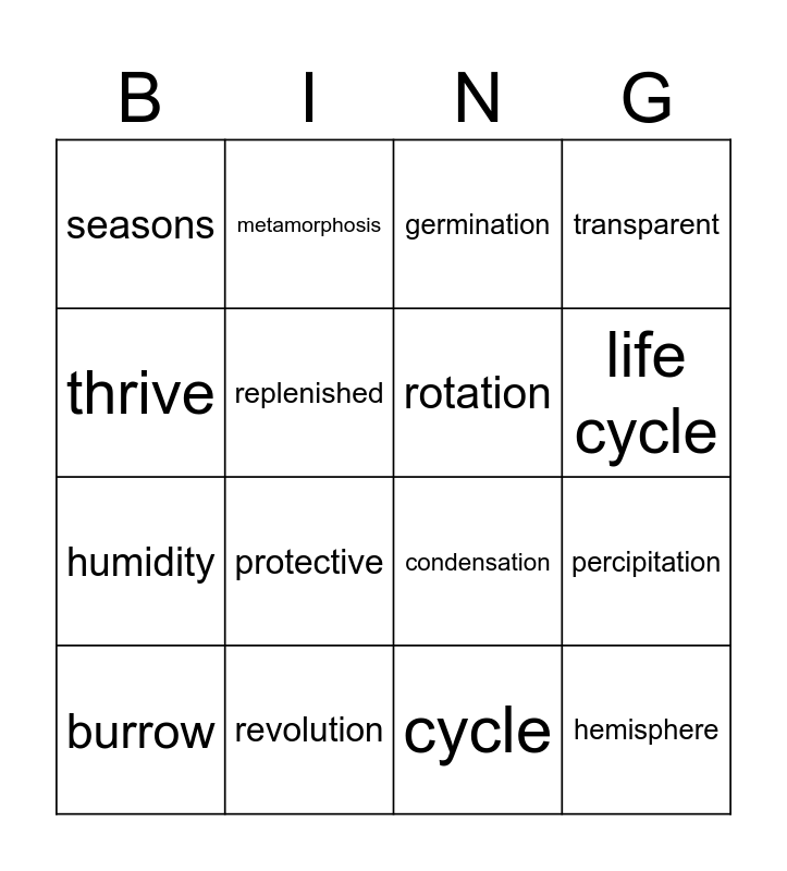 This bingo card has 16 words: revolution, percipitation, germination, seasons, humidity, metamorphosis, condensation, cycle, thrive, replenished, burrow, transparent, protective, life cycle, rotation and hemisphere.