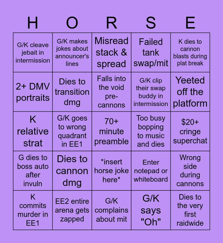 This bingo card has 38 words: DPS baits G/K bait in witch hunt, G/K runs to wrong side in EE2, G/K EE2 counting is hard, Dies to transition dmg, Wrong side during cannons, Dies to cannon dmg, Falls into the void pre-cannons, G forgets about wild charge, K dies to cannon blasts during plat break, G/K clip their swap buddy in intermission, G/K goes to wrong quadrant in EE1, Failed tank swap/mit, 70+ minute preamble, $20+ cringe superchat, 2+ DMV portraits, G dies to boss auto after invuln, G/K clip others during witch hunt, Misread stack & spread, EE1/EE2 spreads venn diagram, Too busy bopping to music and dies, G/K cleave jebait in intermission, EE2 entire arena gets zapped, Yeeted off the platform, K commits murder in EE1, Death by cubes and wing lines, G/K complains about mit, Dies to the very first raidwide, G weaves low blow, Stream goes past 1am EST, G/K complains about visibility of near/far, G/K comments about ion cannon debuffs, *insert horse joke here*, G/K says "Oh", G/K makes jokes about announcer's lines, At least one random fill is a sticky, Enter notepad or whiteboard, K relative strat and G shoots Bersi with TB.
