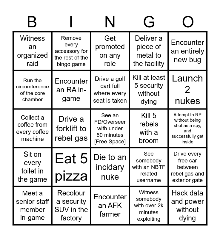 This bingo card has a free space and 35 words: Meet a member of staff in-game, Die to a spy, Hide in somebody's car for at least 5 minutes, Encounter an RA in-game, Die to an incidary nuke, Deliver a piece of metal to the facility, Run the circumference of the core chamber, Die to every turret in the game, Drive a golf cart full where every seat is taken, Have a gunfight in the conference room, Collect a coffee from every coffee machine, Encounter an entirely new bug, Get a piece of pizza, Spend 5 minutes in the observation deck, Witness an organized raid, Kill 5 rebels with a broom, Witness somebody with over 2k minutes exploiting, Drive a forklift to rebel gas, Sit on every toilet in the game, Hack data and power without dying, See somebody with an NBTF related username, Meet a senior staff member in-game, Drive every free car between rebel gas and exterior gate, Recolour a security SUV in the factory, Get promoted on any role, Launch 2 nukes, Go through every factory machine without dying, Kill at least 5 rebels without dying, Kill at least 5 security without dying, Attempt to RP without being shot as a spy, and successfully get inside, Encounter an exploiter, Encounter an AFK farmer, Eat 5 pizza, Remove every accessory for the rest of the bingo game and Change your display name.