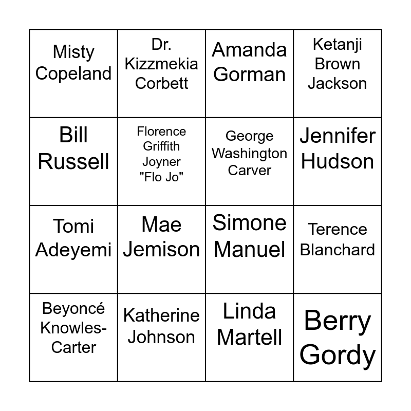 This bingo card has 16 words: Beyoncé Knowles-Carter, Katherine Johnson, Amanda Gorman, Ketanji Brown Jackson, Bill Russell, Dr. Kizzmekia Corbett, Simone Manuel, Terence Blanchard, Misty Copeland, Florence Griffith Joyner "Flo Jo", Linda Martell, Jennifer Hudson, Tomi Adeyemi, Mae Jemison, George Washington Carver and Berry Gordy.