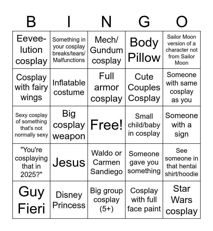 This bingo card has a free space and 29 words: Guy Fieri, Fursuit, Big cosplay weapon, Studio Ghibli cosplay, Eevee-lution cosplay, Mech/ Gundum cosplay, Inflatable costume, Jesus, Small child/baby in cosplay, Disney Princess, Someone with a sign, Star Wars cosplay, Big group cosplay (5+), Cosplay with full face paint, Someone with same cosplay as you, Protesters or religious speaker outside con, Waldo or Carmen Sandiego, "You're cosplaying that in 2025?", Sailor Moon version of a character not from Sailor Moon, Sexy cosplay of something that's not normally sexy, Someone gave you something, My Little Pony cosplay, Cute Couples Cosplay, Cosplay with fairy wings, Body Pillow, Something in your cosplay breaks/tears/ Malfunctions, See someone in that hentai shirt/hoodie, Full armor cosplay and Broken elevator.