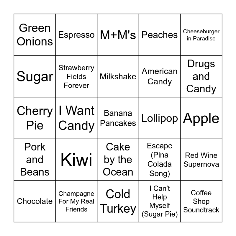 This bingo card has 35 words: American Pie, Watermelon Sugar High, Sugar, We're Goin Down, Strawberry Fields Forever, Cake by the Ocean, Peaches, Sugar, Pour Some Sugar On Me, Milkshake, Chop Suey!, Cherry Pie, Cheeseburger in Paradise, Sugar Sugar, Chicken Fried, Green Onions, Lollipop, I Can't Help Myself (Sugar Pie), I Want Candy, Pork and Beans, Banana Pancakes, Escape (Pina Colada Song), Chocolate, Red Wine Supernova, Champagne For My Real Friends, M+M's, Drugs and Candy, Coffee Shop Soundtrack, Diet Soda Society, American Candy, Apple, Lemon Tree, Cold Turkey, Kiwi, Espresso and One Margarita.