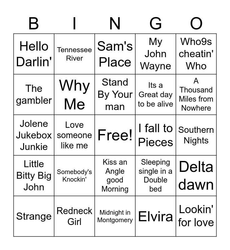 This bingo card has a free space and 39 words: Baby's got her blue jeans on, southern California, I loved "em Every one, Why Me, Strange, Kiss an Angle good Morning, Stand By Your man, She Used to love me a lot, Who9s cheatin' Who, Little Bitty Big John, Love someone like me, My John Wayne, Lookin' for love, Southern Nights, I fall to Pieces, Somebody's Knockin', Rhinestone cowboy, Hello Darlin', Lonely Woman Make good Lovers, Sleeping single in a Double bed, The gambler, Midnight in Montgomery, Its a Great day to be alive, A Thousand Miles from Nowhere, Meet in the middle, She dont know shes beautiful, I try to think about Elvis, Dust on the Bottle, I told you so, Tennessee River, Amarillo By morning, 1982, Sam's Place, Redneck Girl, Elvira, Rose Garden, Delta dawn, Jolene Jukebox Junkie and Cadillac Style.