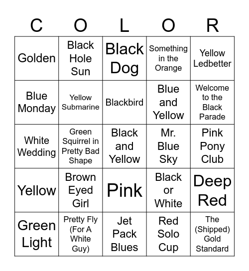 This bingo card has a free space and 34 words: Red Red Wine, Red Solo Cup, Red, Red Dirt Road, Yellow, Yellow Submarine, Yellow Ledbetter, Green Light, Black Hole Sun, Black Betty, Blackbird, Black Dog, Black Magic Woman, Black Horse and the Cherry Tree, Mr. Blue Sky, Welcome to the Black Parade, Pretty Fly (For A White Guy), White Wedding, Brown Eyed Girl, Black or White, Pink, Blue Suede Shoes, Golden, Pink Pony Club, Jet Pack Blues, The (Shipped) Gold Standard, Something in the Orange, Dark Blue, Blue and Yellow, Blue Monday, My Blue Heaven, Green Squirrel in Pretty Bad Shape, Deep Red and Navy Blue.