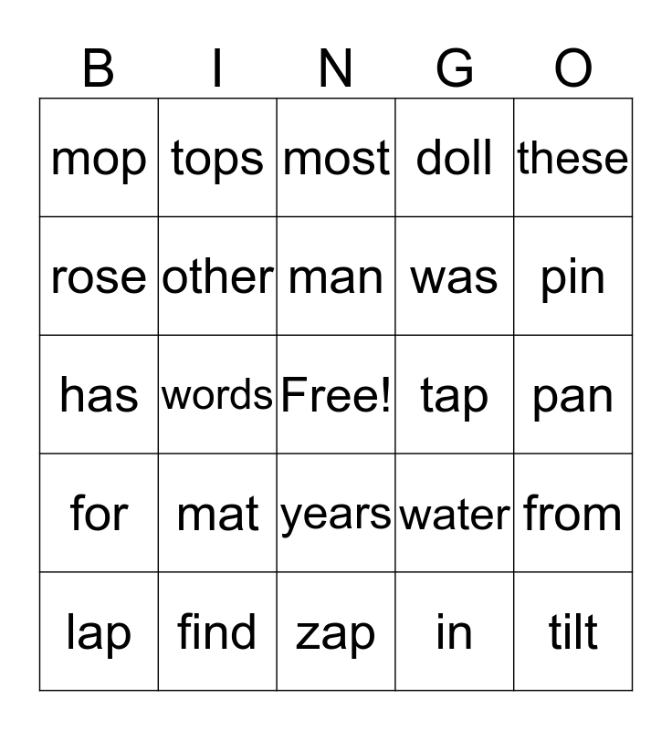 This bingo card has a free space and 78 words: sentence, number, most, the, not, people, things, place, take, you, man, can, doll, mop, home, rose, sit, mat, pig, pan, all, these, has, man, other, work, new, little, know, or, pin, pit, zap, zip, lap, tap, tip, it, lot, tilt, dip, land, past, lost, snap, tops, splat, pots, sip, silt, from, words, water, part, said, some, think, sit, so, years, was, his, no, him, had, of, on, get, for, find, not, top, pop, I, in, it, pin and tip.