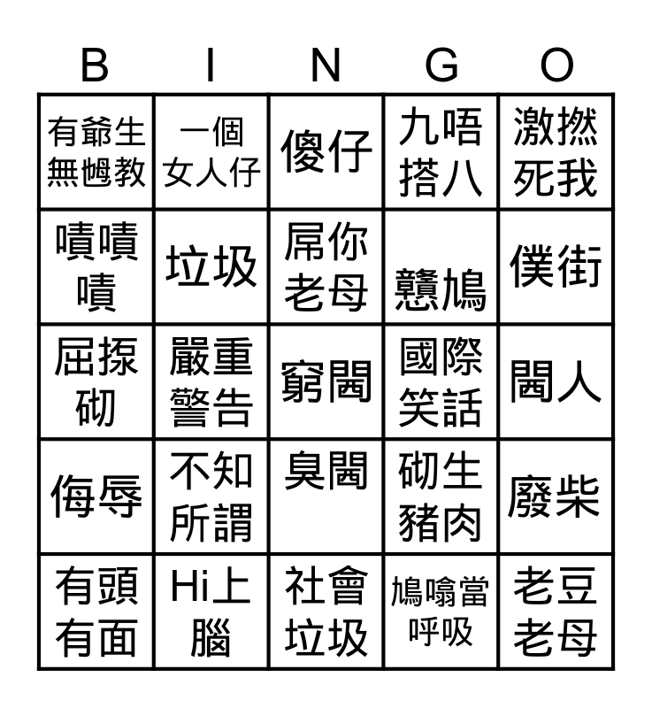 This bingo card has 25 words: 不知所謂, 社會垃圾, 屌你 老母, 有頭 有面, 激撚 死我, 有爺生無乸教, 嘖嘖嘖, 一個 女人仔, 國際笑話, 臭閪, 戇鳩, 屈揼砌, 砌生 豬肉, 廢柴, 垃圾, 老豆 老母, 閪人, 傻仔, 僕街, 嚴重警告, 窮閪, Hi上腦, 侮辱, 九唔 搭八 and 鳩噏當呼吸.