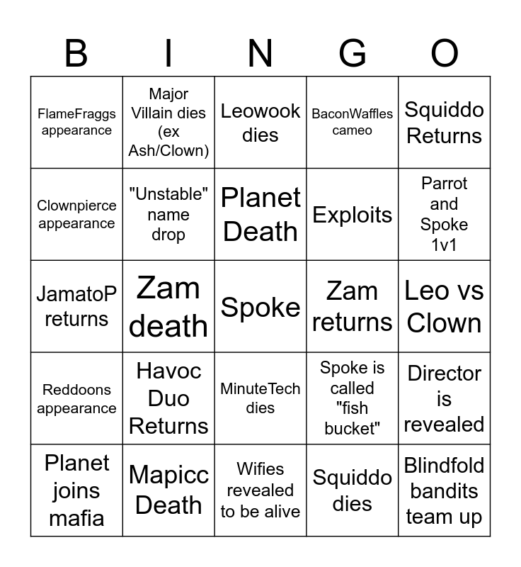 This bingo card has a free space and 24 words: Havoc Duo Returns, Mapicc Death, Planet Death, Planet joins mafia, Squiddo Returns, FlameFraggs appearance, Clownpierce appearance, Major Villain dies (ex Ash/Clown), Zam returns, MinuteTech dies, Exploits, JamatoP returns, Spoke is called "fish bucket", Director is revealed, "Unstable" name drop, Squiddo dies, Leo vs Clown, Leowook dies, Parrot and Spoke 1v1, Zam death, Blindfold bandits team up, Reddoons appearance, BaconWaffles cameo and Wifies revealed to be alive.