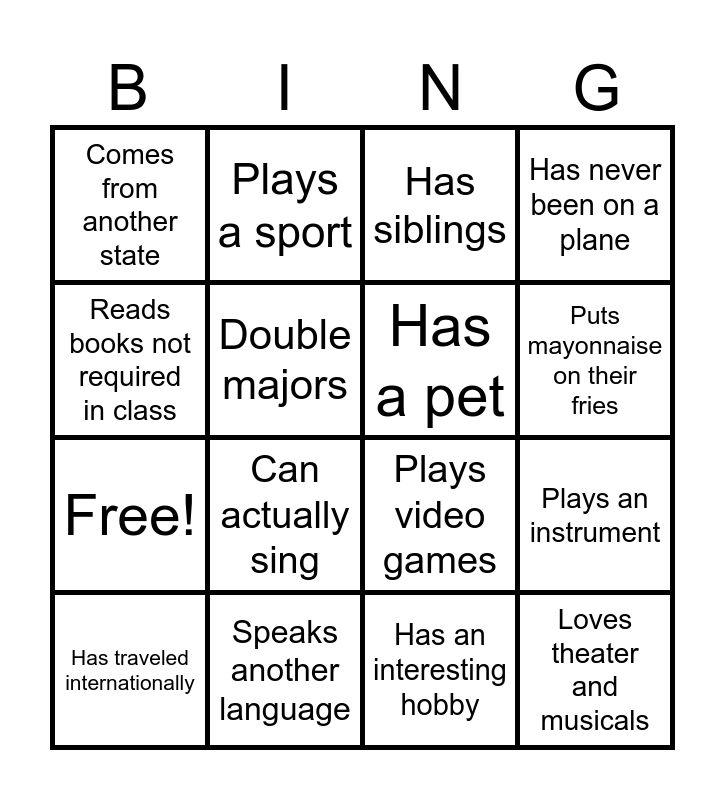 This bingo card has 20 words: Plays an instrument, Likes the food in the caf, Has siblings, Has social media, Has traveled internationally, Reads books not required in class, Speaks another language, Comes from another state, Free!, Plays a sport, Can actually sing, Plays video games, Double majors, Loves theater and musicals, Has a pet, Enjoys nature hikes, Puts mayonnaise on their fries, Has never been on a plane, Has an interesting hobby and Was recruited to come to Bethany.