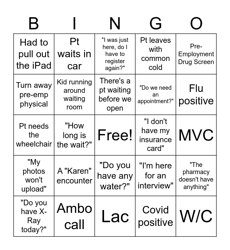 This bingo card has a free space and 29 words: "Do you have X-Ray today?", "Can I get my Medication here?", "How long is the wait?", "Do you have a mask?", Had to pull out the iPad, "I was just here, do I have to register again?", Kid running around waiting room, A "Karen" encounter, "I don't have my insurance card", Ambo call, MVC, W/C, Lac, Covid positive, Flu positive, Pt calls for results, "Do you have any water?", "My photos won't upload", Pre-Employment Drug Screen, Pt needs the wheelchair, "I'm here for an interview", Pt ignores Kiosk, "Do we need an appointment?", Turn away pre-emp physical, Pt leaves with common cold, Pt waits in car, "The pharmacy doesn't have anything", There's a pt waiting before we open and Someone tries to be seen after 8:30.