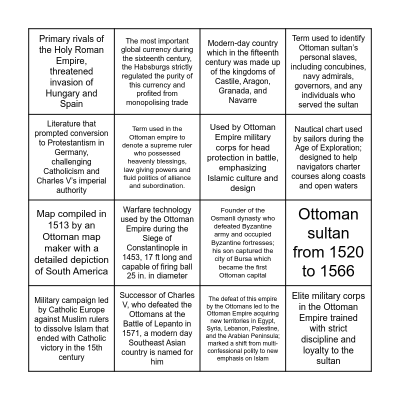 This bingo card has 20 words: Ottoman sultan from 1520 to 1566, Ruler of multiple domains in Europe and the Americas from 1516 and Holy Roman Emperor from 1519 to 1556, Modern-day country which in the fifteenth century was made up of the kingdoms of Castile, Aragon, Granada, and Navarre, This event created a composite monarchy out of Aragon and Castile, but did not create unitary polity, Military campaign led by Catholic Europe against Muslim rulers to dissolve Islam that ended with Catholic victory in the 15th century, Literature that prompted conversion to Protestantism in Germany, challenging Catholicism and Charles V’s imperial authority, Successor of Charles V, who defeated the Ottomans at the Battle of Lepanto in 1571, a modern day Southeast Asian country is named for him, Primary rivals of the Holy Roman Empire, threatened invasion of Hungary and Spain, Map compiled in 1513 by an Ottoman map maker with a detailed depiction of South America, The most important global currency during the sixteenth century, the Habsburgs strictly regulated the purity of this currency and profited from monopolising trade, Warfare technology used by the Ottoman Empire during the Siege of Constantinople in 1453, 17 ft long and capable of firing ball 25 in. in diameter, Founder of the Osmanli dynasty who defeated Byzantine army and occupied Byzantine fortresses; his son captured the city of Bursa which became the first Ottoman capital, Term used in the Ottoman empire to denote a supreme ruler who possessed heavenly blessings, law giving powers and fluid politics of alliance and subordination., Elite military corps in the Ottoman Empire trained with strict discipline and loyalty to the sultan, Used by Ottoman Empire military corps for head protection in battle, emphasizing Islamic culture and design, Empire whose capital was Canstantinople (modern-day Istanbul) and survived until conquered by the Ottomans in 1453, Nautical chart used by sailors during the Age of Exploration; designed to help navigators charter courses along coasts and open waters, Term used to identify Ottoman sultan’s personal slaves, including concubines, navy admirals, governors, and any individuals who served the sultan, The defeat of this empire by the Ottomans led to the Ottoman Empire acquiring new territories in Egypt, Syria, Lebanon, Palestine, and the Arabian Peninsula; marked a shift from multi-confessional polity to new emphasis on Islam and Persian dynasty that ruled from 1501 to 1736; instrumental in shaping Iranian culture during the Islamic Golden Age.