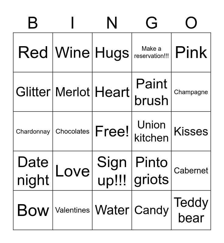 This bingo card has a free space and 24 words: Love, Valentines, Heart, Bow, Pink, Red, Glitter, Wine, Union kitchen, Sign up!!!, Paint brush, Chardonnay, Pinto griots, Cabernet, Merlot, Candy, Kisses, Hugs, Champagne, Chocolates, Teddy bear, Date night, Make a reservation!!! and Water.