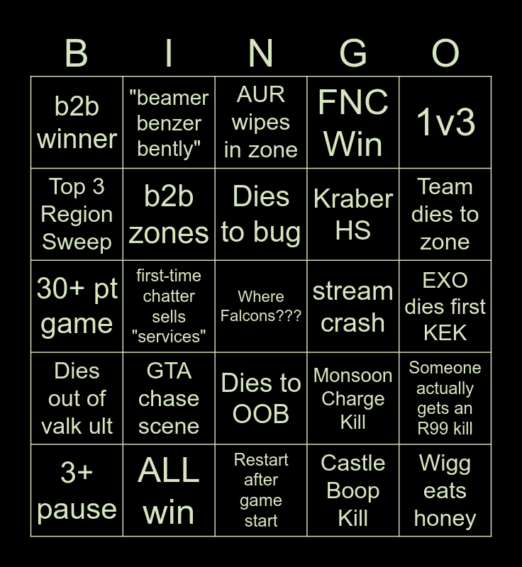 This bingo card has a free space and 33 words: scrims, 4k dmg, first-time chatter sells "services", Mirage pick, Dies out of valk ult, b2b zones, 1v3, 3+ pause, "beamer benzer bently", God-Spot ints, Dies to bug, AUR wipes in zone, 69 pts, Mazer Moment, stream crash, Team dies to zone, ALL win, 30+ pt game, GTA chase scene, Monsoon Charge Kill, Dies to OOB, Shiela gets 3, b2b winner, EXO dies first KEK, Restart after game start, Wigg eats honey, FNC Win, Kraber HS, Top 3 Region Sweep, Someone actually gets an R99 kill, Tracer/Reaper OW, Castle Boop Kill and IGL crashout.