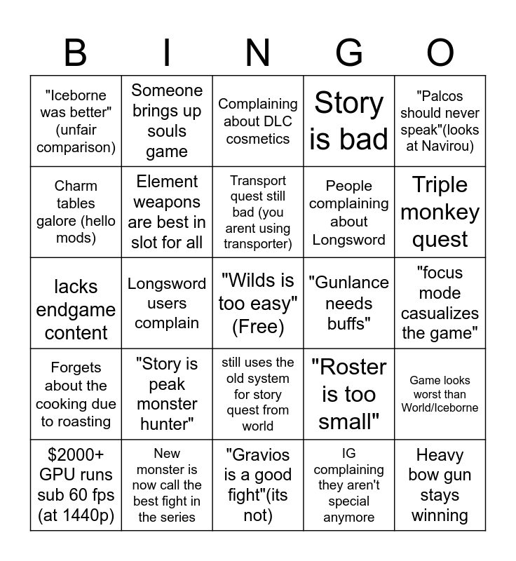 This bingo card has a free space and 24 words: "Story is peak monster hunter", New monster is now call the best fight in the series, Transport quest still bad (you arent using transporter), $2000+ GPU runs sub 60 fps (at 1440p), "Palcos should never speak"(looks at Navirou), "Iceborne was better"(unfair comparison), Charm tables galore (hello mods), Someone brings up souls game, "Gunlance needs buffs", still uses the old system for story quest from world, People complaining about Longsword, lacks endgame content, "Roster is too small", Game looks worst than World/Iceborne, Element weapons are best in slot for all, IG complaining they aren't special anymore, "focus mode casualizes the game", Complaining about DLC cosmetics, Triple monkey quest, Longsword users complain, Heavy bow gun stays winning, Forgets about the cooking due to roasting, Story is bad and "Gravios is a good fight"(its not).