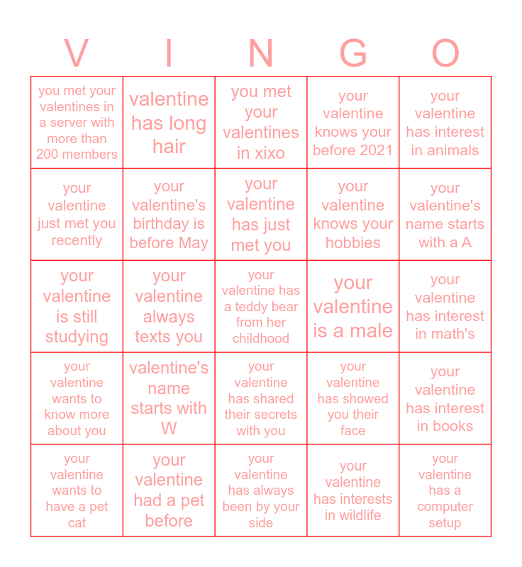 This bingo card has a free space and 24 words: valentine's name starts with W, your valentine had a pet before, your valentine has just met you, your valentine wants to have a pet cat, your valentine has interest in animals, you met your valentines in a server with more than 200 members, your valentine just met you recently, valentine has long hair, your valentine is a male, your valentine has shared their secrets with you, your valentine knows your hobbies, your valentine is still studying, your valentine has showed you their face, your valentine has interest in books, your valentine's birthday is before May, your valentine has interests in wildlife, your valentine has interest in math's, you met your valentines in xixo, your valentine's name starts with a A, your valentine always texts you, your valentine has a computer setup, your valentine wants to know more about you, your valentine knows your before 2021 and your valentine has always been by your side.