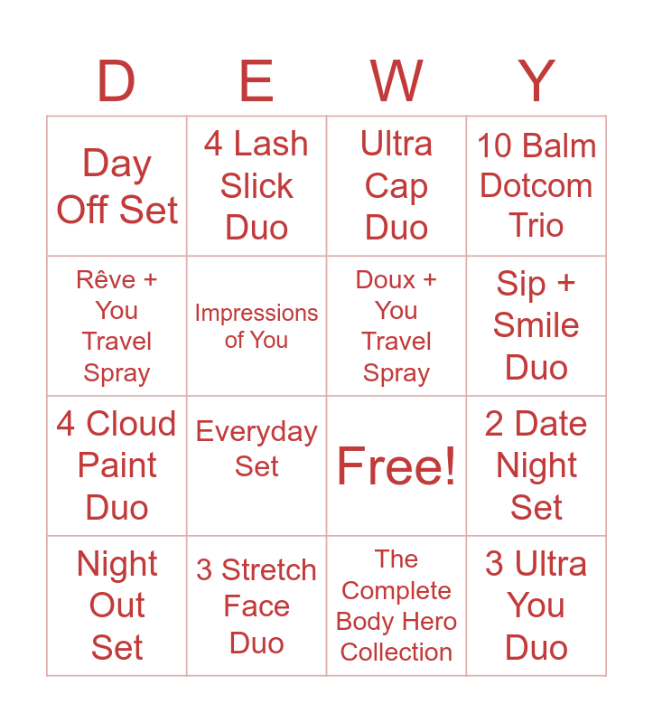This bingo card has 21 words: 3 Stretch Face Duo, 2 Body Hero Duo, 4 Lash Slick Duo, 2 Glossier Brow Duo, The Complete Body Hero Collection, Doux + You Travel Spray, Day Off Set, Ultra Cap Duo, Free!, Sip + Smile Duo, 4 Cloud Paint Duo, 10 Balm Dotcom Trio, 3 Ultra You Duo, Dewy Day Set, Impressions of You, 5 Balm + Line Duo, Night Out Set, Everyday Set, Rêve + You Travel Spray, 2 Date Night Set and 2 Travel Trio.