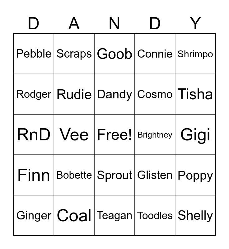 This bingo card has a free space and 28 words: Poppy, Boxten, Cosmo, Toodles, Rodger, Goob, Scraps, Finn, Brightney, Ginger, RnD, Connie, Coal, Teagan, Tisha, Looey, Bobette, Rudie, Dandy, Sprout, Pebble, Astro, Shelly, Vee, Gigi, Glisten, Shrimpo and Flutter.