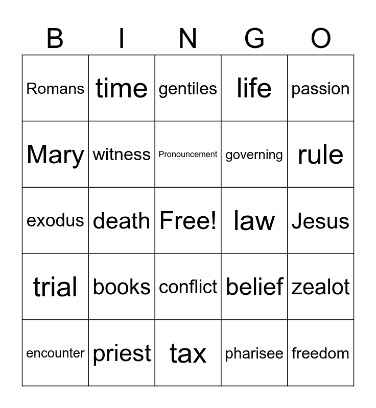 This bingo card has a free space and 39 words: Nativity, calling, recognition, witness, encounter, conflict, Pronouncement, miracle, passion, trial, death, life, freedom, Jesus, law, books, story, Romans, Jewish, belief, Mary, tax, governing, rule, family, status, Jerusalem, chosen, land, time, Moses, Slaves, gentiles, priest, pharisee, essene, zealot, exodus and end.