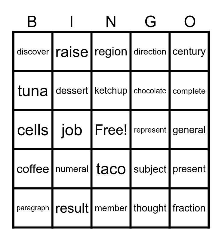 This bingo card has a free space and 24 words: paragraph, numeral, ketchup, thought, century, discover, raise, region, represent, general, cells, dessert, subject, present, tuna, result, member, direction, complete, coffee, job, taco, chocolate and fraction.