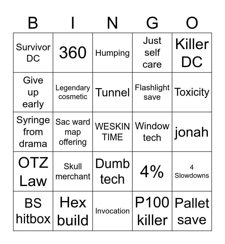 This bingo card has a free space and 24 words: Skull merchant, Hex build, Tunnel, BS hitbox, Killer DC, Survivor DC, Give up early, 360, Window tech, Dumb tech, Flashlight save, Syringe from drama, 4%, 4 Slowdowns, Legendary cosmetic, P100 killer, jonah, Humping, Toxicity, Sac ward map offering, Pallet save, OTZ Law, Just self care and Invocation.