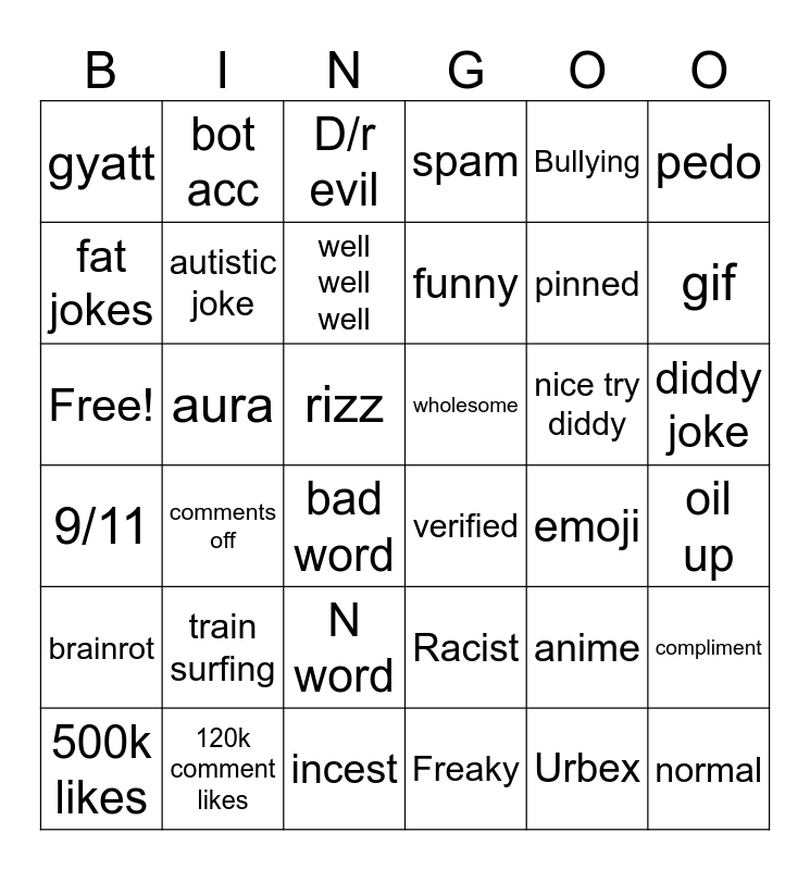 This bingo card has 36 words: Racist, N word, Freaky, fat jokes, 9/11, wholesome, autistic joke, incest, Bullying, anime, gif, spam, compliment, aura, funny, gyatt, brainrot, nice try diddy, Free!, D/r evil, rizz, comments off, verified, bad word, emoji, bot acc, pinned, 120k comment likes, well well well, pedo, normal, 500k likes, oil up, diddy joke, train surfing and Urbex.