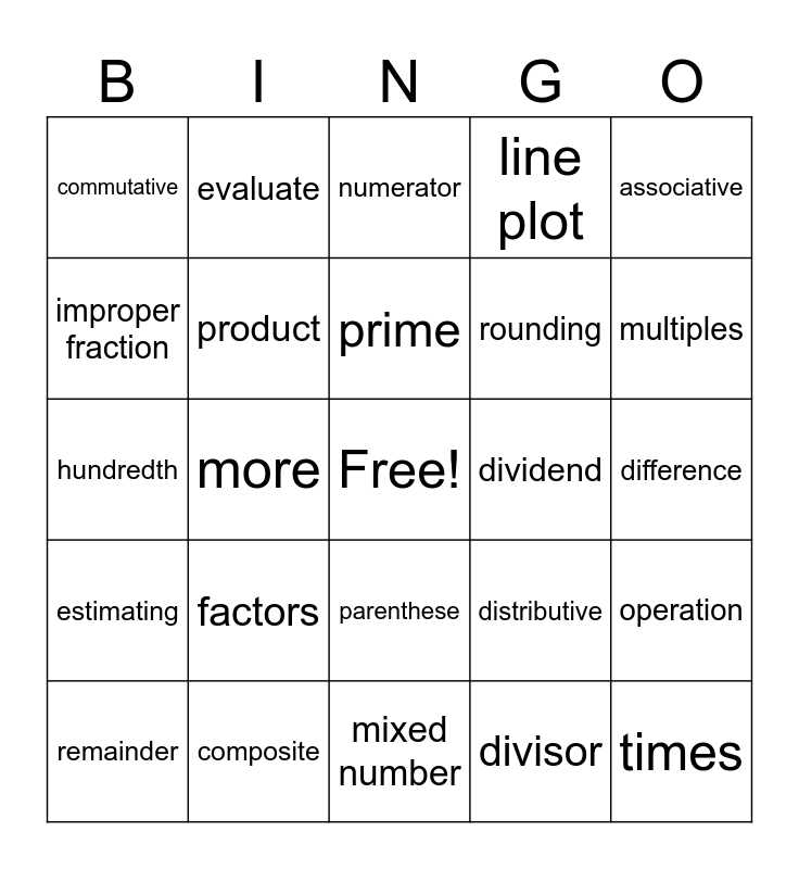 This bingo card has a free space and 29 words: remainder, sum, more, and, commutative, numerator, product, factors, dividend, composite, difference, times, mixed number, divisor, multiples, fraction, parenthese, estimating, associative, hundredth, distributive, of, rounding, improper fraction, line plot, evaluate, operation, prime and decimal.