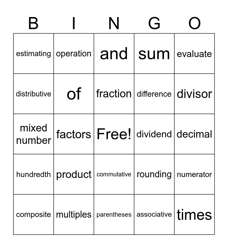 This bingo card has a free space and 29 words: composite, improper fraction, factors, more, estimating, and, of, product, dividend, multiples, decimal, times, parentheses, associative, divisor, prime, commutative, hundredth, evaluate, mixed number, rounding, line plot, difference, distributive, sum, operation, numerator, fraction and remainder.