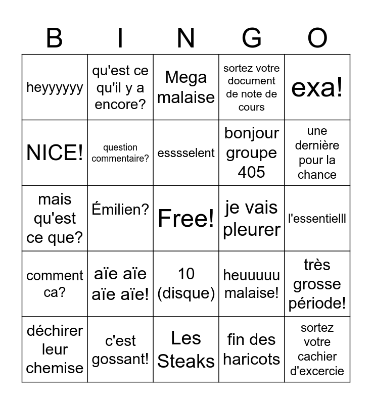 This bingo card has a free space and 24 words: aïe aïe aïe aïe!, c'est gossant!, esssselent, déchirer leur chemise, exa!, heyyyyyy, NICE!, qu'est ce qu'il y a encore?, je vais pleurer, 10 (disque), bonjour groupe 405, mais qu'est ce que?, heuuuuu malaise!, très grosse période!, question commentaire?, fin des haricots, l'essentielll, Mega malaise, une dernière pour la chance, Émilien?, sortez votre cachier d'excercie, comment ca?, sortez votre document de note de cours and Les Steaks.