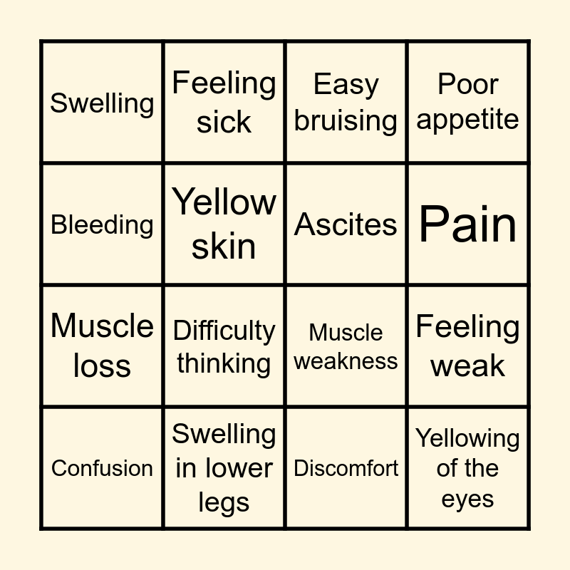 This bingo card has 26 words: Free!, Itching skin, Pain, Nausea, Bleeding, Swelling, Yellow skin, Feeling sick, Discomfort, Bleeding gums, Muscle loss, Muscle weakness, Muscle cramps, Belly pain, Feeling weak, Fatigue, Poor appetite, Yellowing of the eyes, Easy bruising, Confusion, Difficulty thinking, Memory Loss, Swelling in lower legs, Dark urine, Ascites and Varices.