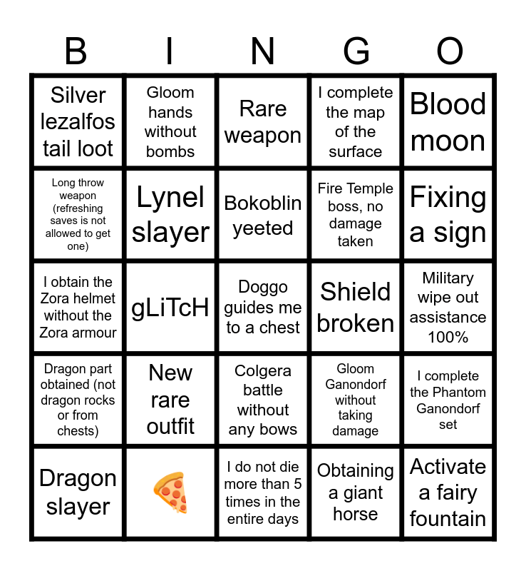 This bingo card has a free space and 24 words: New rare outfit, 🍕, Bokoblin yeeted, Dragon slayer, Blood moon, Silver lezalfos tail loot, Long throw weapon (refreshing saves is not allowed to get one), Gloom hands without bombs, Shield broken, Colgera battle without any bows, Fire Temple boss, no damage taken, I obtain the Zora helmet without the Zora armour, Gloom Ganondorf without taking damage, I complete the Phantom Ganondorf set, Lynel slayer, Obtaining a giant horse, Military wipe out assistance 100%, Rare weapon, Fixing a sign, gLiTcH, Activate a fairy fountain, Dragon part obtained (not dragon rocks or from chests), I complete the map of the surface and I do not die more than 5 times in the entire days.