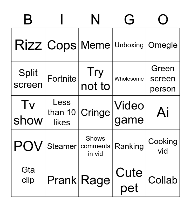 This bingo card has a free space and 24 words: Gta clip, Steamer, Try not to, Cute pet, Omegle, Rizz, Cops, Meme, Video game, Ai, Tv show, Fortnite, Ranking, Cooking vid, Split screen, Prank, Rage, Unboxing, Green screen person, POV, Less than 10 likes, Shows comments in vid, Wholesome and Collab.