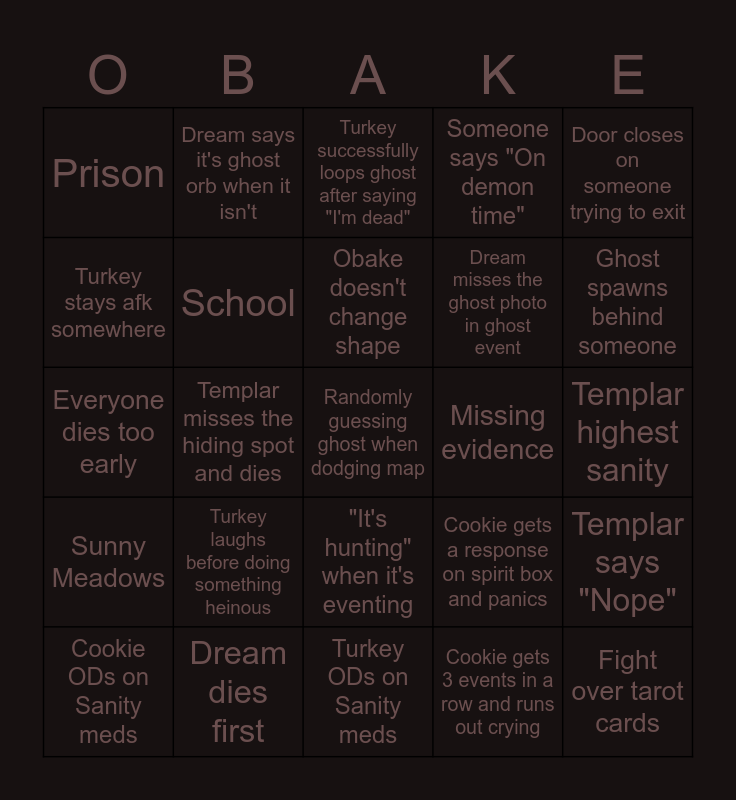 This bingo card has a free space and 24 words: Turkey laughs before doing something heinous, Dream dies first, Obake doesn't change shape, Cookie ODs on Sanity meds, Door closes on someone trying to exit, Prison, Turkey stays afk somewhere, Dream says it's ghost orb when it isn't, Missing evidence, "It's hunting" when it's eventing, Dream misses the ghost photo in ghost event, Everyone dies too early, Cookie gets a response on spirit box and panics, Templar says "Nope", School, Cookie gets 3 events in a row and runs out crying, Templar highest sanity, Turkey successfully loops ghost after saying "I'm dead", Ghost spawns behind someone, Templar misses the hiding spot and dies, Fight over tarot cards, Sunny Meadows, Someone says "On demon time" and Turkey ODs on Sanity meds.