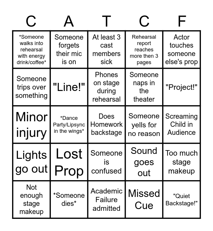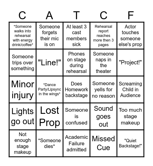 This bingo card has 30 words: *Someone dies*, *Someone breaks on stage*, *Dance Party/Lipsync in the wings*, *Someone doesn't remember their quote during quote book reading*, *Someone walks into rehearsal with energy drink/coffee*, At least 3 cast members sick, "Line!", Someone is confused, Someone yells for no reason, Academic Failure admitted, Screaming Child in Audience, Does Homework backstage, Missed Cue, "Quiet Backstage!", "Project!", Someone cries, Sound goes out, Lights go out, Lost Prop, Actor touches someone else's prop, Minor injury, Someone isn't on the right page, Someone forgets their mic is on, Someone naps in the theater, Someone trips over something, Rehearsal report reaches more then 3 pages, Too much stage makeup, Not enough stage makeup, Phones on stage during rehearsal and Someone shows up late.