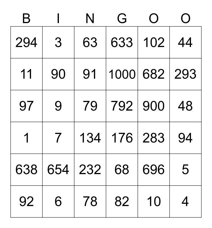 This bingo card has 36 words: 1, 7, 78, 1000, 900, 48, 294, 6, 63, 68, 682, 44, 638, 9, 91, 633, 696, 94, 11, 90, 134, 176, 283, 5, 97, 3, 79, 82, 102, 293, 92, 654, 232, 792, 10 and 4.