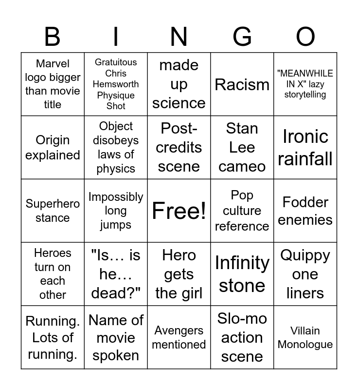 This bingo card has a free space and 24 words: "Is… is he… dead?", Name of movie spoken, Post-credits scene, Running. Lots of running., "MEANWHILE IN X" lazy storytelling, Marvel logo bigger than movie title, Origin explained, Gratuitous Chris Hemsworth Physique Shot, Pop culture reference, Hero gets the girl, Stan Lee cameo, Superhero stance, Infinity stone, Quippy one liners, Object disobeys laws of physics, Slo-mo action scene, Fodder enemies, made up science, Ironic rainfall, Impossibly long jumps, Villain Monologue, Heroes turn on each other, Racism and Avengers mentioned.