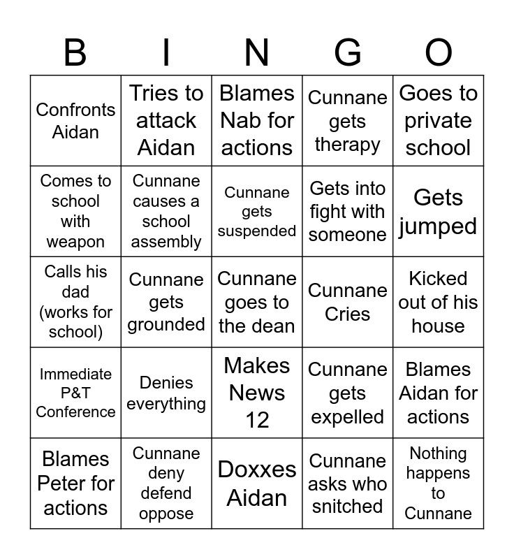 This bingo card has a free space and 24 words: Denies everything, Cunnane deny defend oppose, Cunnane gets suspended, Blames Peter for actions, Goes to private school, Confronts Aidan, Comes to school with weapon, Tries to attack Aidan, Cunnane Cries, Makes News 12, Gets into fight with someone, Calls his dad (works for school), Cunnane gets expelled, Blames Aidan for actions, Cunnane causes a school assembly, Cunnane asks who snitched, Kicked out of his house, Blames Nab for actions, Gets jumped, Cunnane gets grounded, Nothing happens to Cunnane, Immediate P&T Conference, Cunnane gets therapy and Doxxes Aidan.