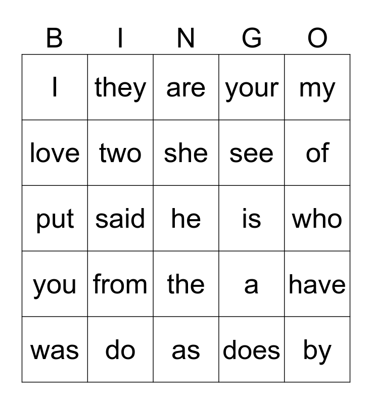 This bingo card has 28 words: have, all, see, does, love, are, they, you, is, was, put, your, do, as, of, for, from, two, she, the, I, by, he, said, who, a, my and to.